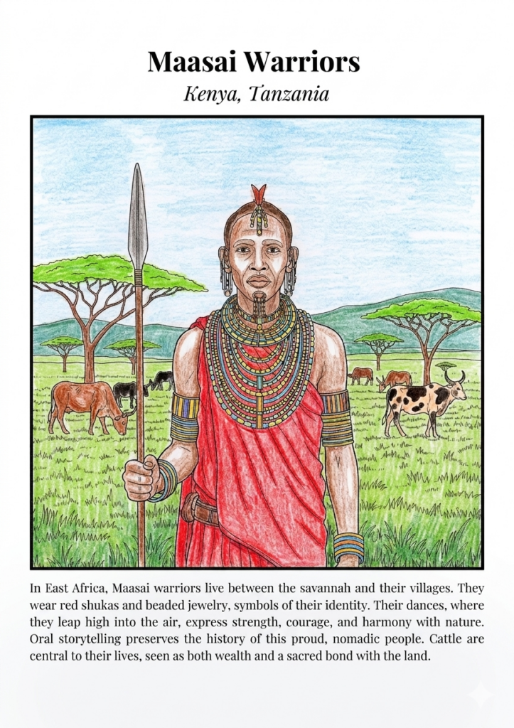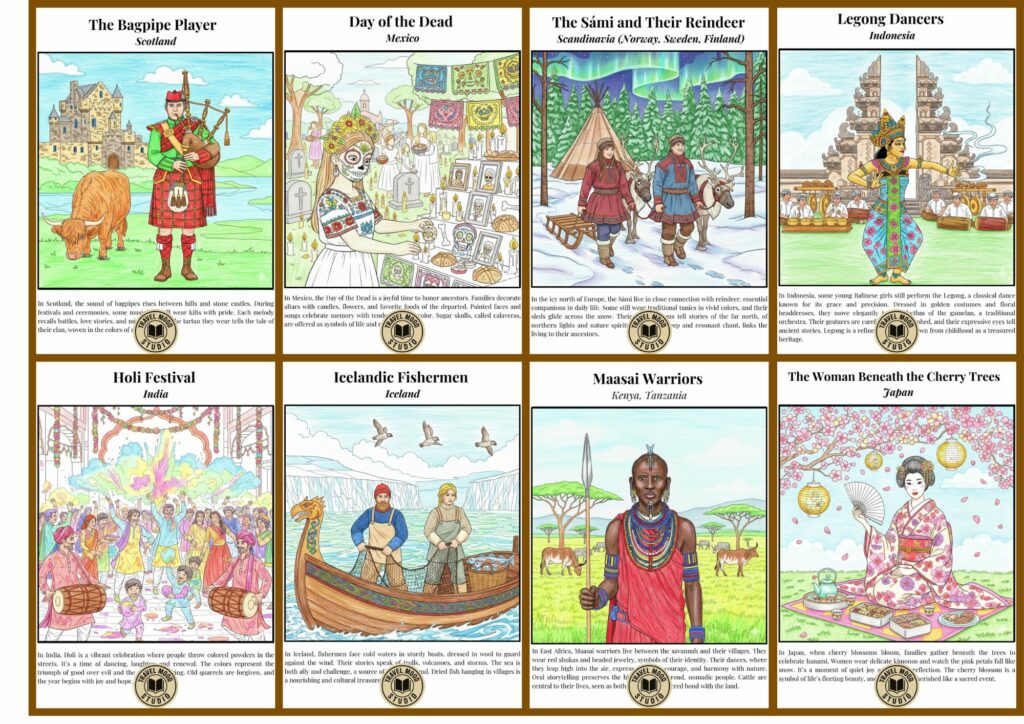 Children progress at their own pace: coloring, reading, understanding… and bit by bit, these cultures come to life. Each portrait is an invitation to learn how people around the world live, what they celebrate, and the traditions they pass down.