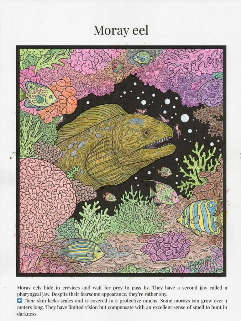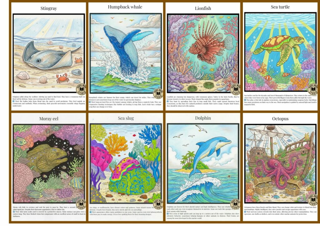 Throughout the pages, children will explore the fascinating diversity of marine life: their characteristics, habitats, surprising traits, and their vital role in balancing ecosystems. Every illustration serves as an invitation to observe, understand, and marvel at the underwater world.